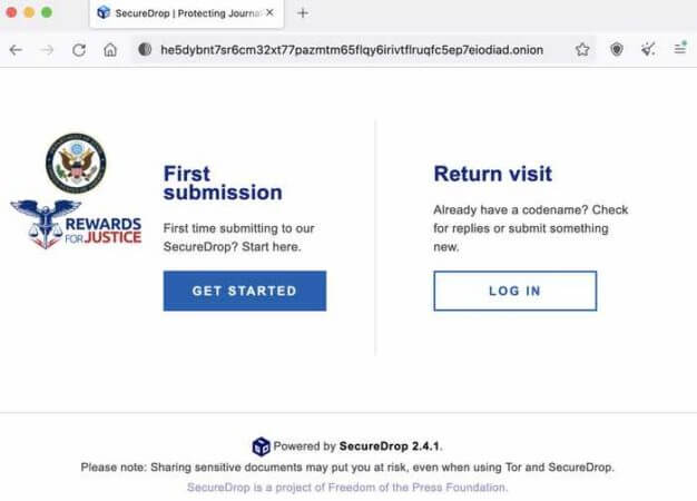 You can visit the Rewards for Justice tips line via Tor at: he5dybnt7sr6cm32xt77pazmtm65flqy6irivtflruqfc5ep7eiodiad.onion