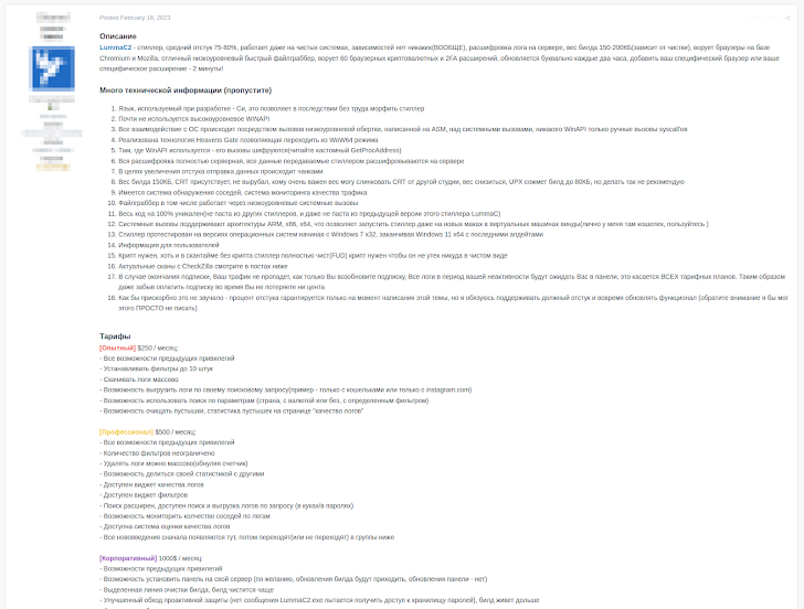 | LummaC2 stealer offering their services on a russian-speaking darknet forum |