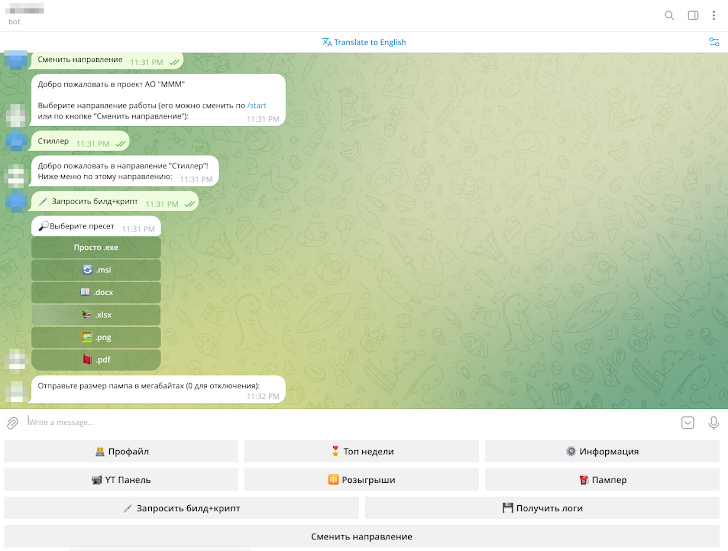 | Traffer team Telegram bot, providing the “worker” with prepared malicious files used for infostealer spreading |