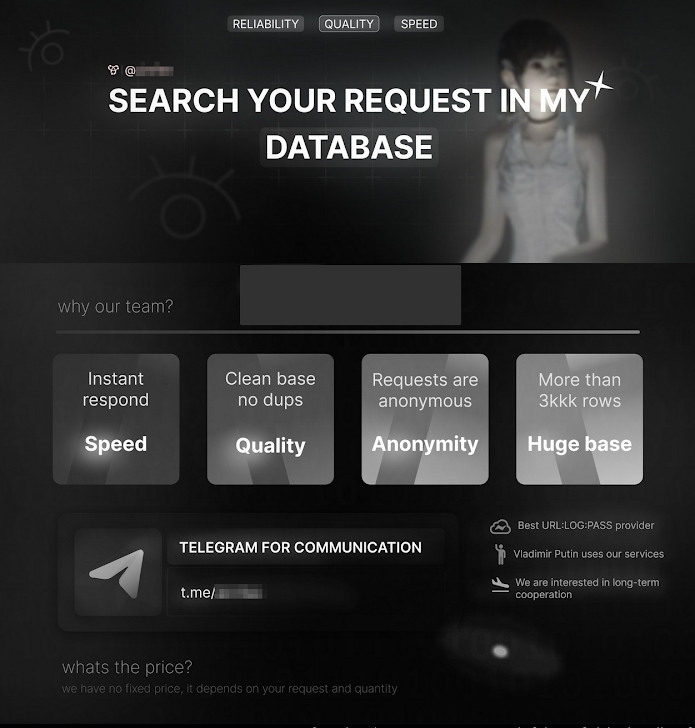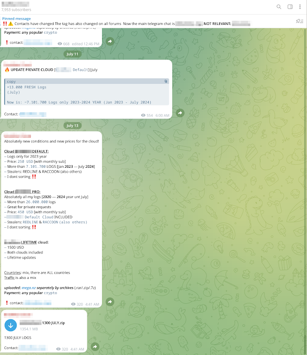 | Log cloud channel on Telegram, offering millions of stealer logs collected (mostly) from other semi-public sources |