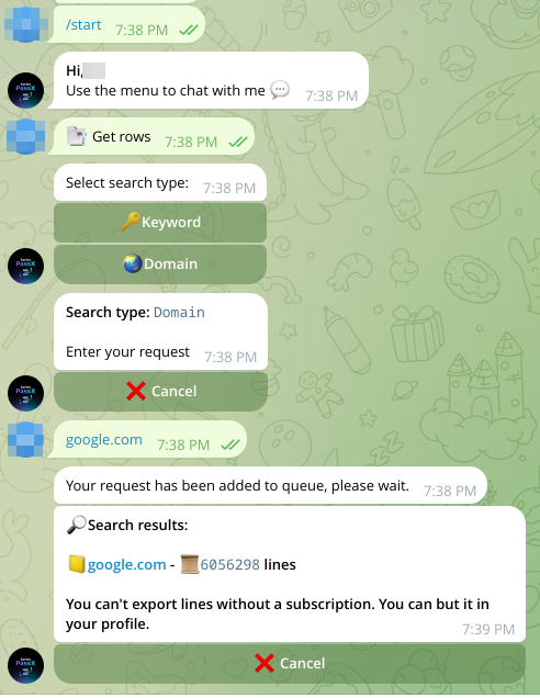 Otherwise, url:log:pass resellers operate exactly the same way as log cloud operators, except they have to store and deal with less data. Other services, in the form of both websites and Telegram bots exist, that allow you to search through them, so you don’t even have to know how to use grep or where to obtain this kind of logs.