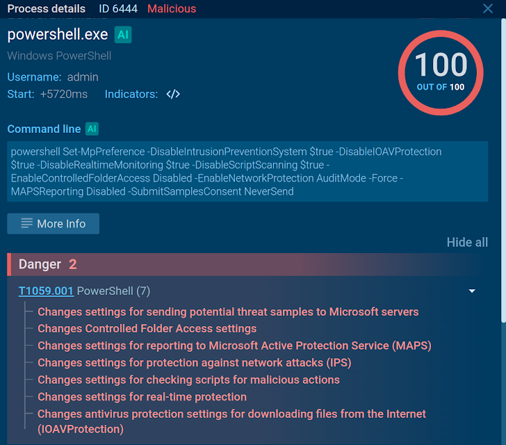 Consider this analysis of a BlankGrabber sample, a malware family used for stealing sensitive data from infected systems. After the execution, the malicious program launches several processes, including PowerShell, to change the system settings to avoid detection.