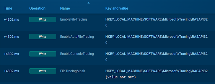 By setting ENABLEAUTOFILETRACING and other registry names related to RASAPI32 to 0, the attacker ensures that logs are not generated. This makes it harder for security software like antiviruses to identify the incident.