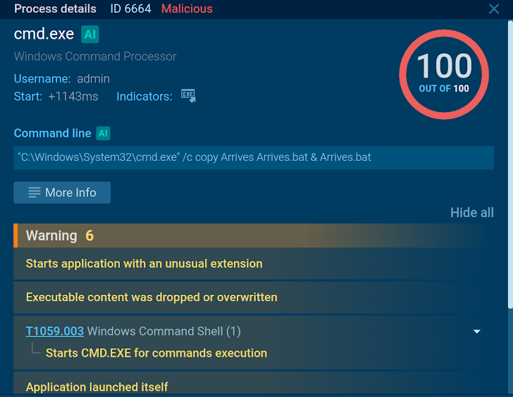 | The sandbox assigns a score of 100 to the cmd.exe process, marking it as malicious |
