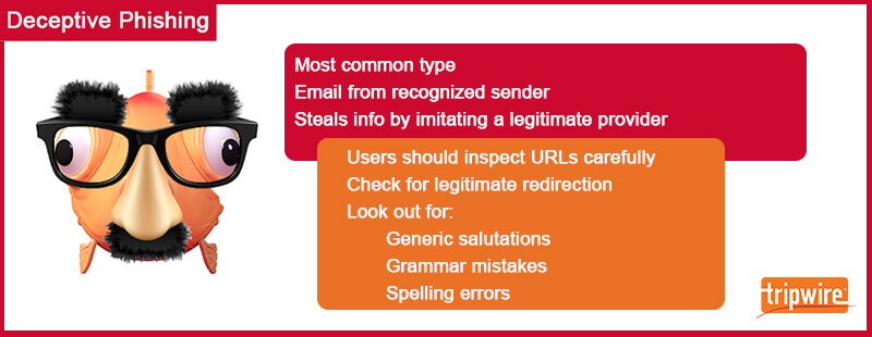 Deceptive phishing is by far the most common type of phishing scam. In this ploy, fraudsters impersonate a legitimate company in an attempt to steal people’s personal data or login credentials. Those emails frequently use threats and a sense of urgency to scare users into doing what the attackers want.