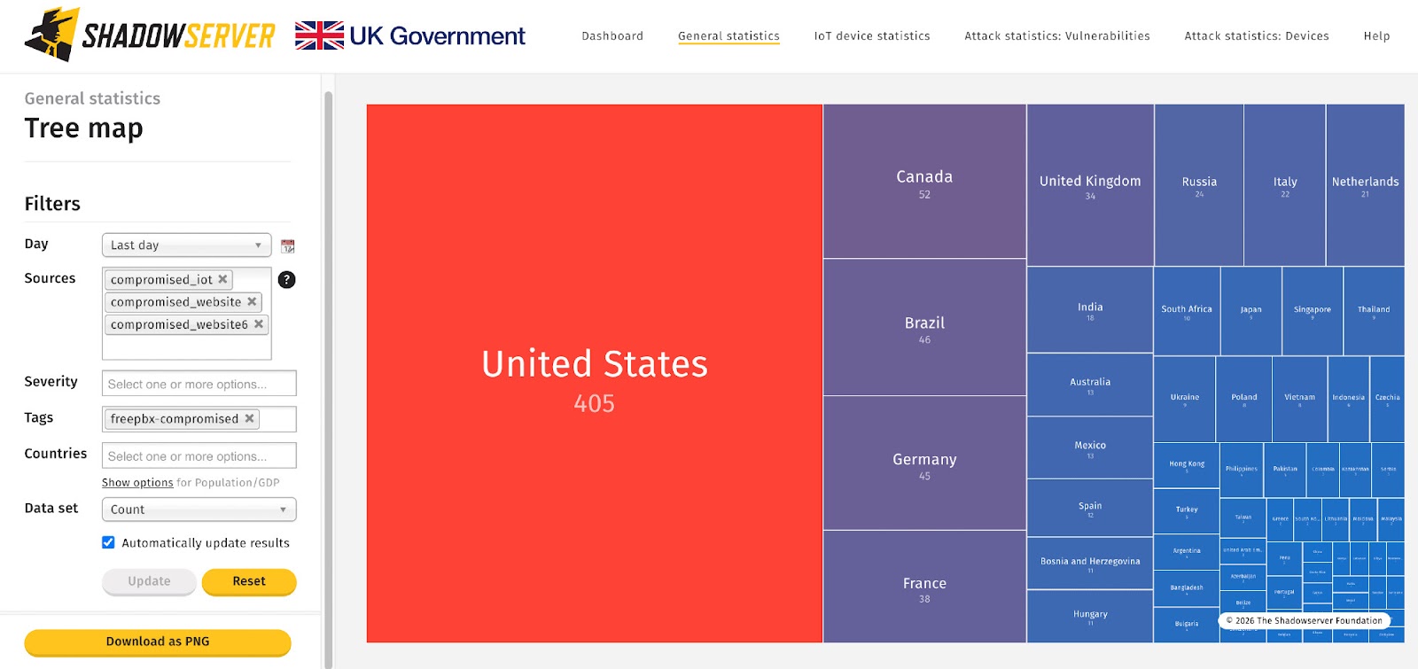 The Shadowserver Foundation has revealed that over 900 Sangoma FreePBX instances still remain infected with web shells as part of attacks that exploited a command injection vulnerability starting in December 2025.