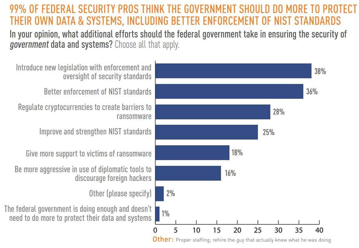 In total, 99% of federal security professionals said that the government should do more to protect their own data and systems. Nearly two-fifths (38%) of respondents specified that the government should introduce new legislation with enforcement and oversight of security standards. Slightly fewer (36%) voiced their desire for better enforcement of NIST standards, followed by regulating cryptocurrencies to create barriers to ransomware at 28%.