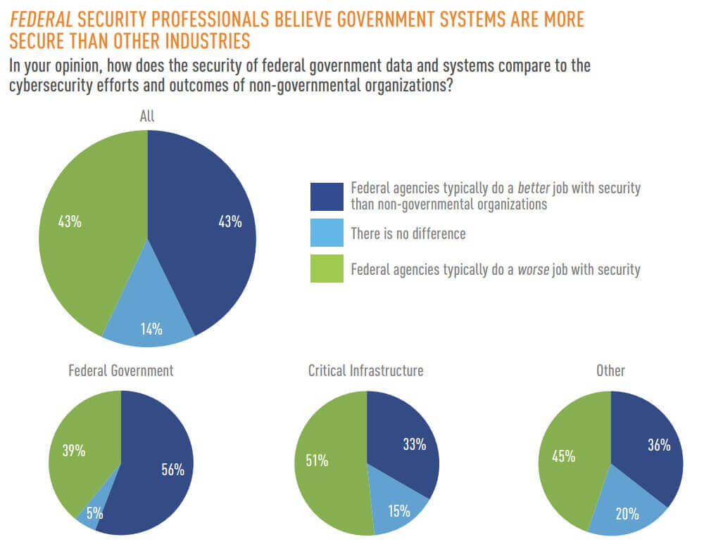 Not everyone agreed on this point. Indeed, nearly half (46%) of survey participants working at non-federal organizations felt that federal agencies did a worse job with securing their systems than their employers. It was even higher among critical infrastructure respondents at 50%.
