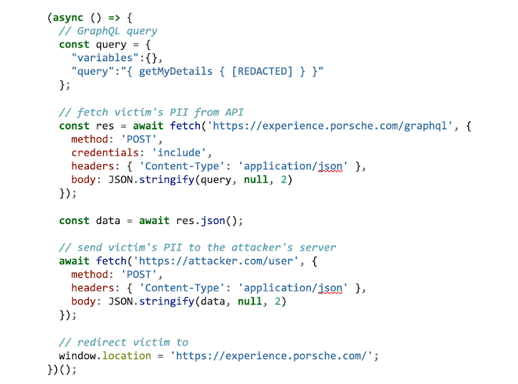 The next step was to write the malicious exfiltrate.js script, downloaded and executed by our XSS payload. For victims, with an active session on experience.porsche.com, the jwtToken auth cookie is automatically included in requests to the API. All we need is to trigger the request with the appropriate GraphQL query and send the response to our remote server. To make the attack a bit sturdier, after that we will redirect the browser to the Porsche Experience website.