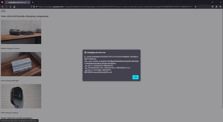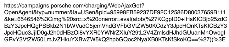 The /charging/WebAjaxGet endpoint of the vulnerable website (campaigns.porsche.com) did not properly sanitize nor encode query string parameter values before including them in the HTML server response. Bad actors could have exploited this issue to inject arbitrary code into the server response, which would end up being executed by the web browser into the victims’ session context. Below is the special crafted URL that triggered the alert dialog box in the image above:
