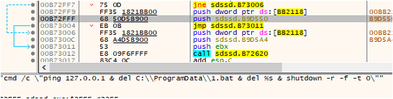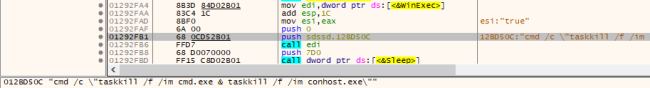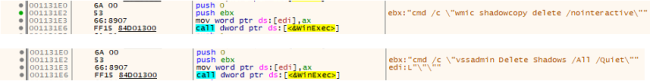 After decrypting the data, it deletes the shadow copies from the system, after which it retrieves the command from the decrypted data and executes it using the WinExec() API.