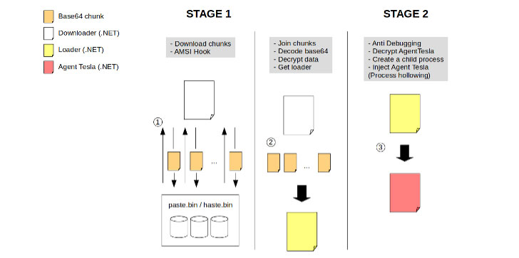 Besides this, Agent Tesla now attempts to modify code in AMSI in a bid to skip scans of malicious payloads fetched by the first-stage downloader, which then grabs obfuscated base64-encoded code from Pastebin (or Hastebin) that acts as the loader for the Agent Tesla malware.
