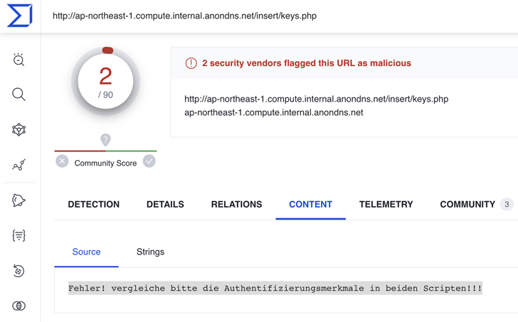 - One of the intermediate versions of aws.sh referenced the FQDN ap-northeast-1.compute.internal.anondns[.]net , which returned the German error message Fehler! vergleiche bitte die Authentifizierungsmerkmale in beiden Scripten!!! (which translates to Error! please compare the authentication features in both scripts!!) when visited by a VirusTotal scan on 2023-06-23: