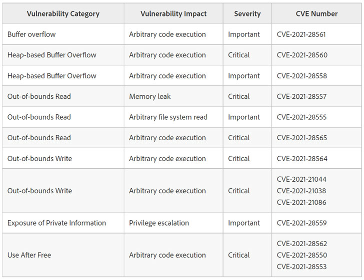 10 critical and four important vulnerabilities were addressed in Adobe Acrobat and Reader, followed by remediation for five critical flaws (CVE-2021-21101-CVE-2021-21105) in Adobe Illustrator that could lead to arbitrary code execution in the context of the current user. Adobe credited Kushal Arvind Shah of Fortinet’s FortiGuard Labs with reporting three of the five vulnerabilities.