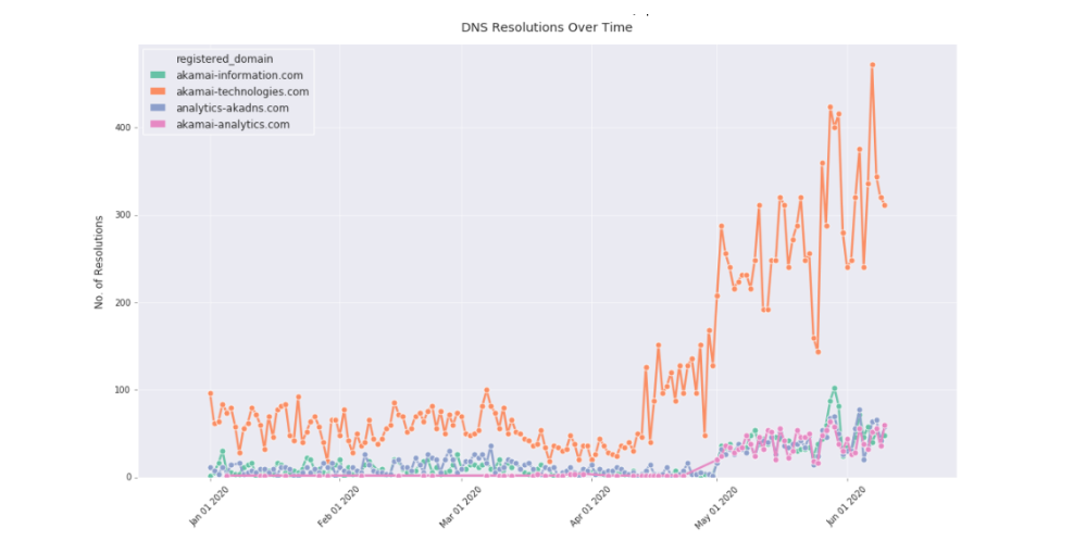The volume of queries that Black Lotus Labs observed to each of the C2 domains saw a marked increase in traffic to all the domains, especially akamai-technologies[.]com, beginning in May. Researchers said that the increase in traffic is due to queries originating from a single victim from the financial services industry.