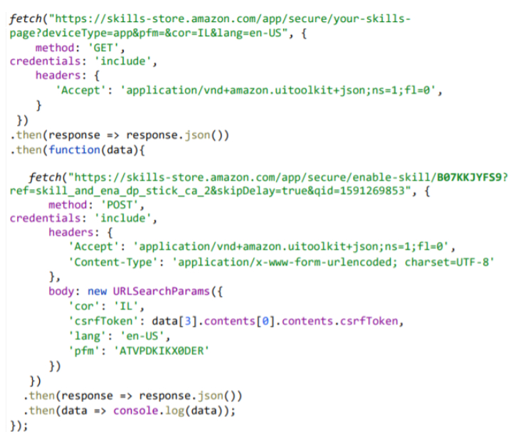 But with the token in possession, a bad actor can create valid requests to the backend server and perform actions on the victim’s behalf, such as installing and enabling a new skill for the victim remotely.