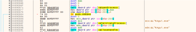 Ransomware uses CreateToolhelp32Snapshot() to retrieve the running processes. It compares with a predefined list of hardcoded processes. If any of the hardcoded processes are detected as running, the ransomware proceeds to terminate those processes using the TerminateProcess, as shown in the below fig: