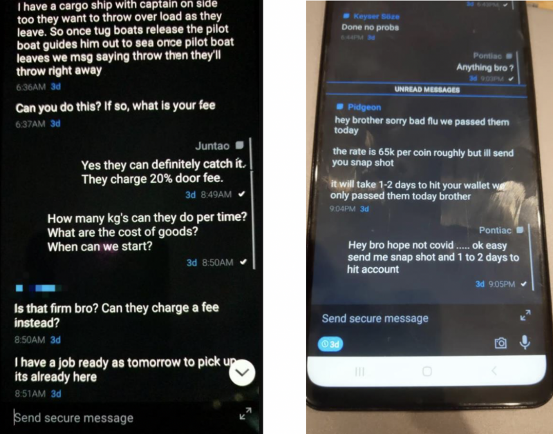 Photos of chats on An0m devices seized from criminal groups. Source: Court documents