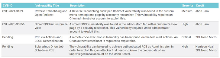 Besides the aforementioned two flaws, the update squashes two other bugs, including a high-severity stored cross-site scripting (XSS) vulnerability in the “add custom tab” within customize view page (CVE-2020-35856) and a reverse tabnabbing and open redirect vulnerability in the custom menu item options page (CVE-2021-3109), both of which require an Orion administrator account for successful exploitation.