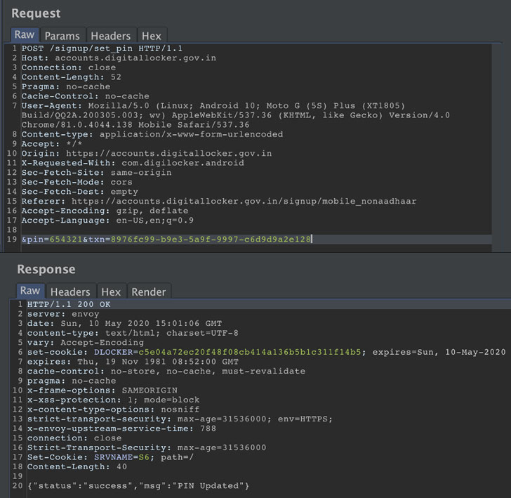 It’s worth noting that the mobile app version of Digilocker also comes with a 4-digit PIN for an added layer of security. But the researcher said it was possible to modify the API calls to authenticate the PIN by associating the PIN to another user (identified with a version-5 UUID) and successfully login in as the victim.