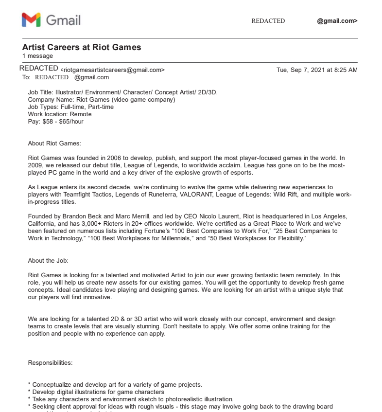 This email submitted as part of Riot’s lawsuit includes a fake listing for a video game artist/illustrator.