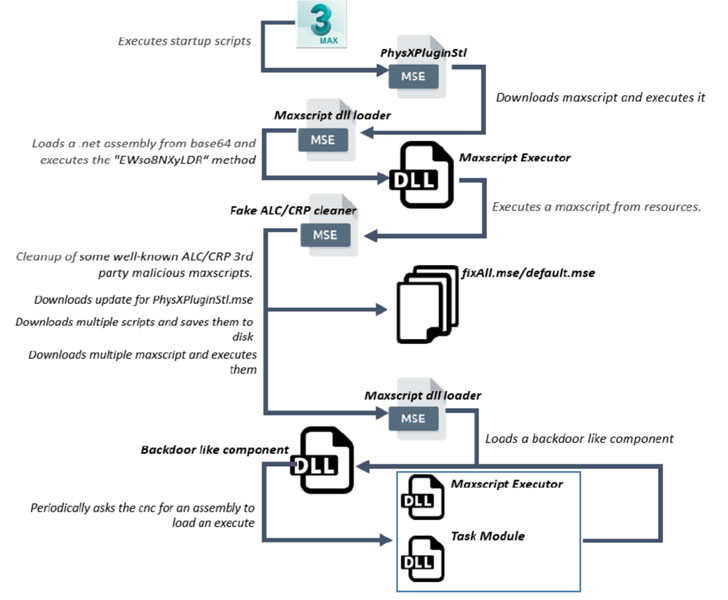 The binaries, in turn, are responsible for downloading other malicious MAXScripts capable of collecting information about the compromised machine and exfiltrating the details to the remote server, which transmits a final payload that can capture screenshots and gather passwords from web browsers such as Firefox, Google Chrome, and Internet Explorer.