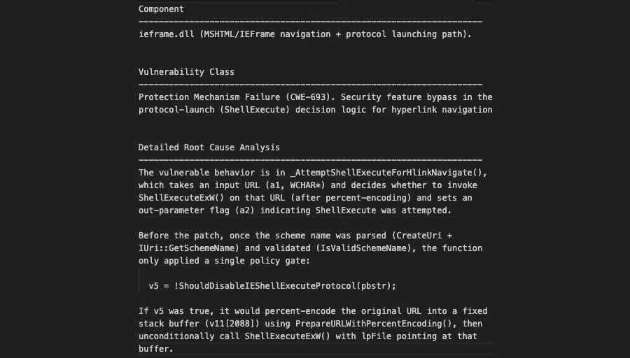 The web infrastructure company said CVE-2026-21513 is rooted in the logic within “ieframe.dll” that handles hyperlink navigation, and that it’s the result of insufficient validation of the target URL, which allows attacker-controlled input to reach code paths that invoke ShellExecuteExW. This, in turn, enables execution of local or remote resources outside the intended browser security context.