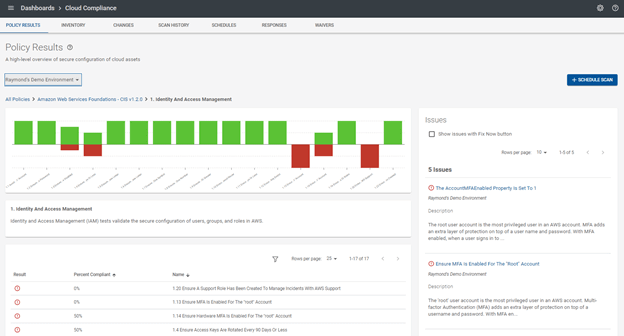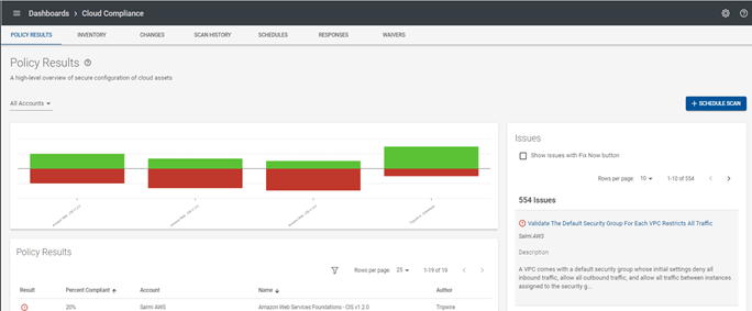 Tripwire Configuration Manager ofrece una interfaz intuitiva que incluye cuadros de mando gráficos, que llaman la atención sobre las áreas clave de interés, haciendo hincapié en los puntos focales que se priorizan en función de la gravedad. Configuration Manager es especialmente eficaz porque permite a los usuarios supervisar las configuraciones de sus cuentas IaaS en comparación con los puntos de referencia de la CIS. Esto hace que las tareas de remediación sean mucho más fáciles para los administradores de sistemas, así como para los equipos de seguridad, ayudando así a proteger de la deriva de la configuración.
