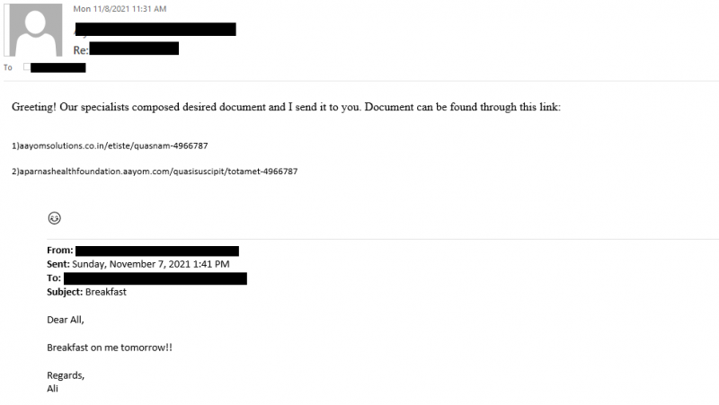 The malicious emails carried links (aayomsolutions[.]co[.]in/etiste/quasnam[]-4966787 and aparnashealthfoundation[.]aayom.com/quasisuscipit/totamet[-]4966787) that dropped a .ZIP file containing a malicious Microsoft Excel sheet that downloads and executes a malicious DLL related to the Qbot banking trojan.