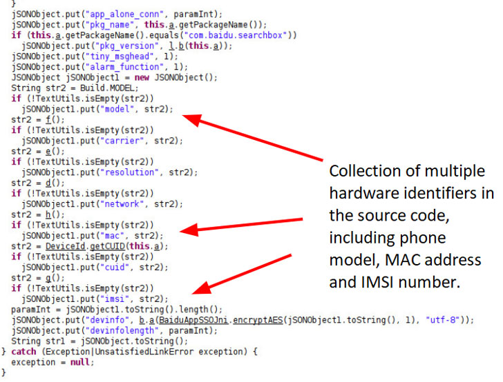 The two apps in question—Baidu Maps and Baidu Search Box—were found to collect device identifiers, such as the International Mobile Subscriber Identity (IMSI) number or MAC address, without users’ knowledge, thus making them potentially trackable online.