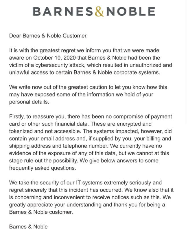 “It is with the greatest regret we inform you that we were made aware on October 10, 2020 that Barnes & Noble had been the victim of a cybersecurity attack, which resulted in unauthorized and unlawful access to certain Barnes & Noble corporate systems.”