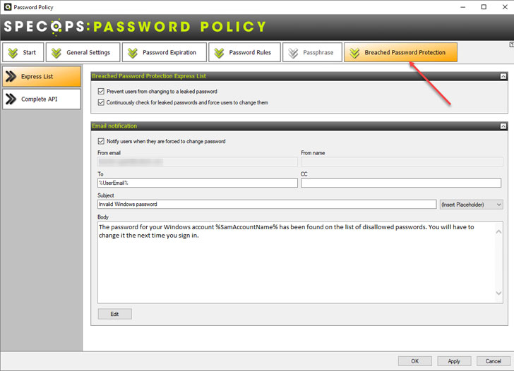 Specops Password Policy provides strong Active Directory password policies, allowing organizations to extend the Active Directory password policy capabilities far beyond what is included by default. In addition, with Specops Breached Password Protection, organizations receive continuous protection from breached passwords, helping businesses to protect against end-users using passwords found on breach password lists.
