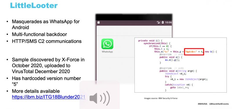 The latest: a custom Android backdoor dubbed “LittleLooter” – used exclusively by the threat actor, as far as researchers have been able to determine – that IBM Security X-Force detailed for the first time at Black Hat USA 2021.