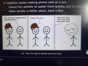 “I met my friend ‘Bob,’” the researcher explained. “This neighbor woke me up two times during last day. He woke me up because he was making phone calls at 2 a.m. in the morning, and he was speaking really loudly. So, the second night I went to see him and I asked him politely to speak more quietly. He told me ‘Yeah, sure, no problem.’ But there was no change.”