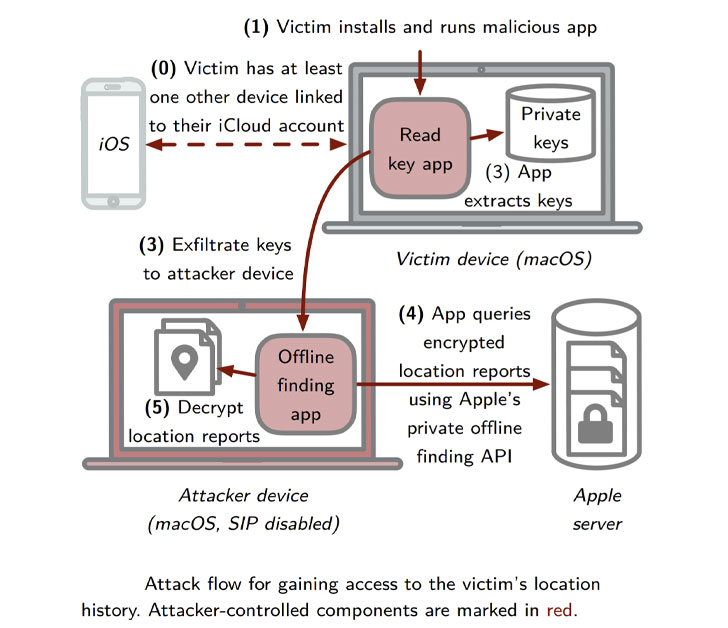 “Law enforcement agencies could exploit this issue to deanonymize participants of (political) demonstrations even when participants put their phones in flight mode,” the researchers said, adding “malicious macOS applications can retrieve and decrypt the [offline finding] location reports of the last seven days for all its users and for all of their devices as cached rolling advertisement keys are stored on the file system in cleartext.”