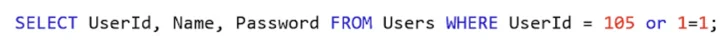 If the user input contains malicious code, such as “105 or 1=1,” it is not executed as SQL. Instead, it’s treated as a value to be compared to the UserId in the database.
