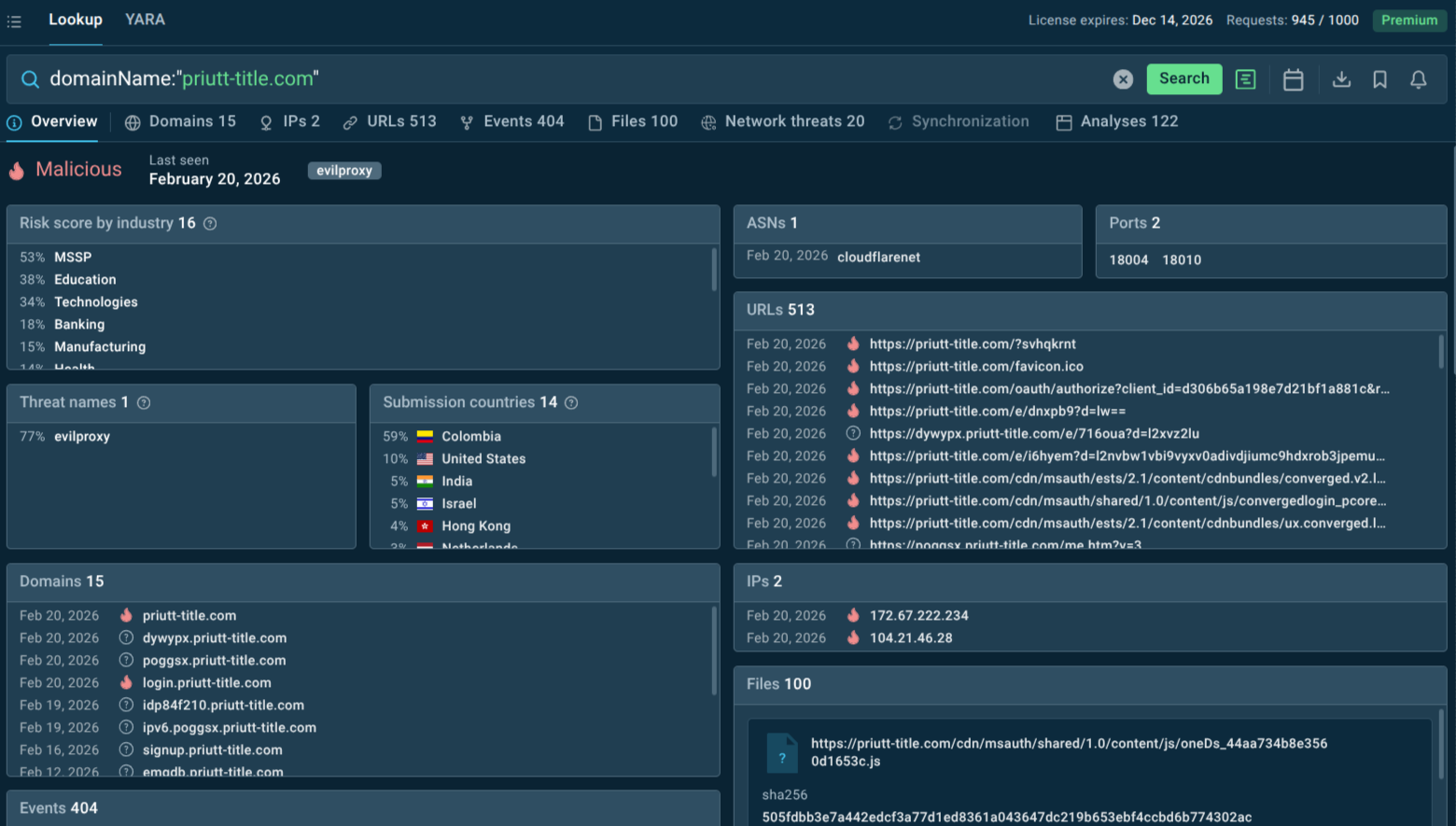 A single lookup allows us to understand that a doubtful domain spotted in the network traffic is most probably malicious, engaged in campaigns targeting IT, finance, and educational businesses all over the world right now, and linked to more indicators that can be used for further detection tuning.