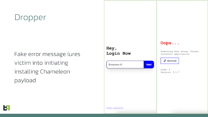 Once installed, the app displays a fake login page for a CRM tool and then displays a bogus error message urging the victims to reinstall the app, when, in reality, it deploys the Chameleon payload.