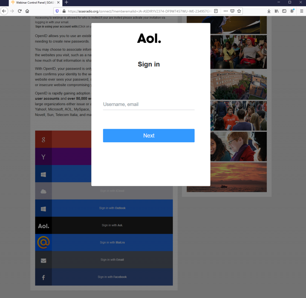 TA453 bolstered credibility by setting up additional fake personas besides “Dr. Kendel.” The personas masqueraded as legitimate affiliates of SOAS to deliver the malicious links. As shown in the image of a credential-harvesting webpage shown below, TA453 offers targets the ability to use “OpenID” to log in via a list of email providers: Google, Yahoo, Microsoft, iCloud, Outlook, AOL, mail.ru, Email and Facebook. The website URI was “hxxps://soasradio[.]org/connect/?memberemailid= [RedactedInitials of Target]-[String of alphanumeric characters].”