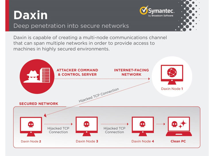“Daxin malware is a highly sophisticated rootkit backdoor with complex, stealthy command-and-control (C2) functionality that enables remote actors to communicate with secured devices not connected directly to the internet,” the U.S. Cybersecurity and Infrastructure Security Agency (CISA) said in an independent advisory.