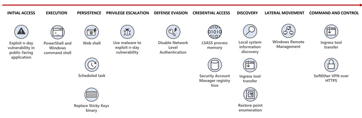 Initial access is facilitated by means of exploiting known vulnerabilities in public-facing servers and deploying web shells like China Chopper, followed by establishing persistent access over Remote Desktop Protocol (RDP), deploy a VPN bridge to connect to a remote server, and harvest credentials using Mimikatz.