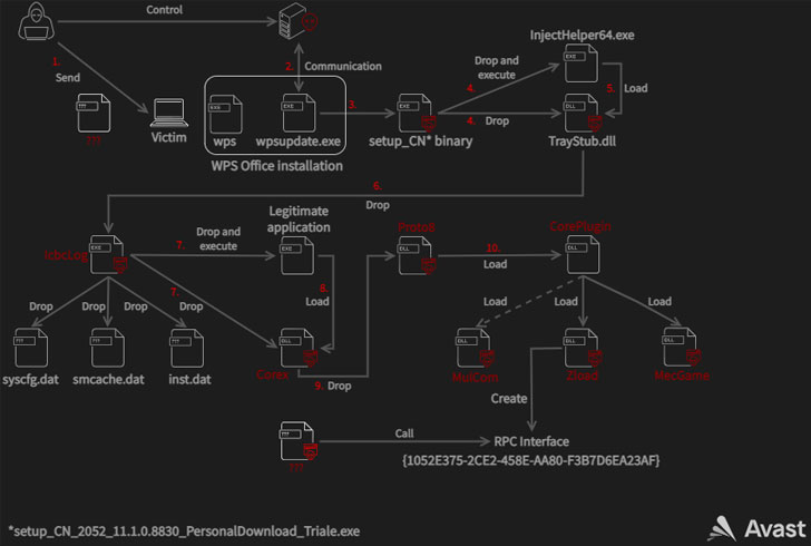 In the case observed by the Czech security firm, the vulnerability was used to drop a malicious binary from a fake update server with the domain update.wps[.]cn that triggers a multi-stage infection chain that leads to the deployment of intermediate payloads the allows for privilege escalation before ultimately dropping the Proto8 module.