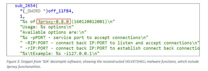 The payload, dubbed VELVETSHELL, is an amalgamation of two open-source tools, a Unix backdoor named Tiny SHell and a proxy utility called 3proxy. It also supports capabilities to execute arbitrary commands, download/upload files, and establish tunnels for proxying network traffic.