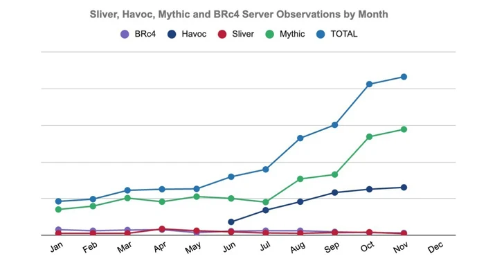 “Both Havoc and Mythic have also become relatively popular but are still observed in far lower numbers than Cobalt Strike, Meterpreter, or Viper,” the company said. “Four other well-known frameworks are Sliver, Havoc, Brute Ratel (BRc4), and Mythic.”