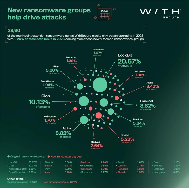 The ever-evolving nature of the ransomware landscape is further evidenced by the fact that 29 of the 60 ransomware groups currently active began operations this year, per WithSecure, in part driven by the source code leaks of Babuk, Conti, and LockBit over the years.