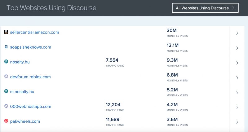 According to market-share and web-usage statistics, the top website using Discourse is sellercentral.amazon.com, which sees a flood of 30 million monthly users. Discourse is also used to run the community forum for the popular radio show Car Talk.