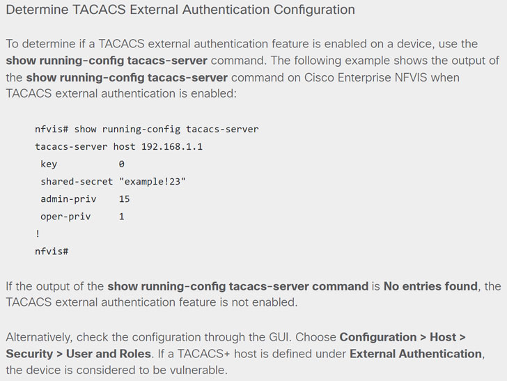 It’s worth pointing out that enterprise NFVIS deployments are impacted by this vulnerability only if TACACS external authentication method is configured on a targeted device, which can be determined by running the “show running-config tacacs-server” command. “If the output of the show running-config tacacs-server command is No entries found, the TACACS external authentication feature is not enabled,” the company noted.