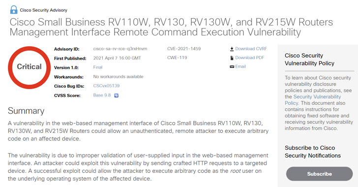 The post “Cisco Will Not Patch Critical RCE Flaw Affecting End-of-Life Business Routers” appeared first on The Hacker News