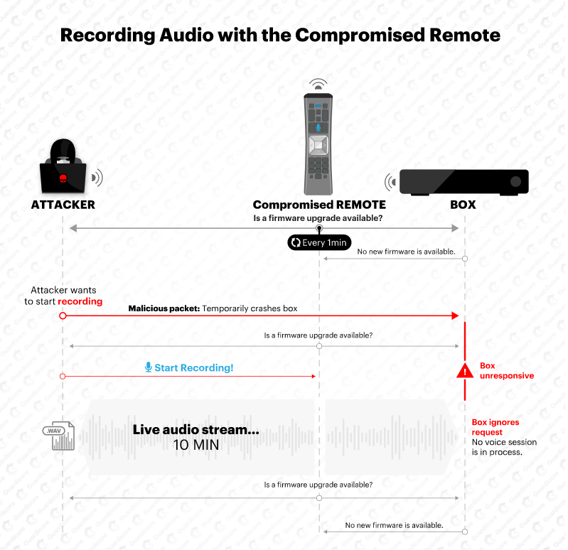 “The hackers took advantage of this process and created a script that would attempt to slip a modified packet into the update stream,” according to AT&T. “This packet did not actually include the recording command, but rather told the remote to change its update checks from once every 24 hours to once per minute. Then, they uploaded the code needed to start recording voices in small packets, so they would not be detected.”